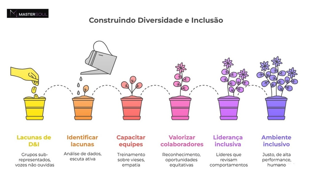Promover Diversidade e Inclusão no ambiente de trabalho exige intenção, estratégia e continuidade. Não se trata de ações pontuais ou discursos inspiradores, mas de um processo que envolve diagnóstico, desenvolvimento humano e transformação da forma de liderar.